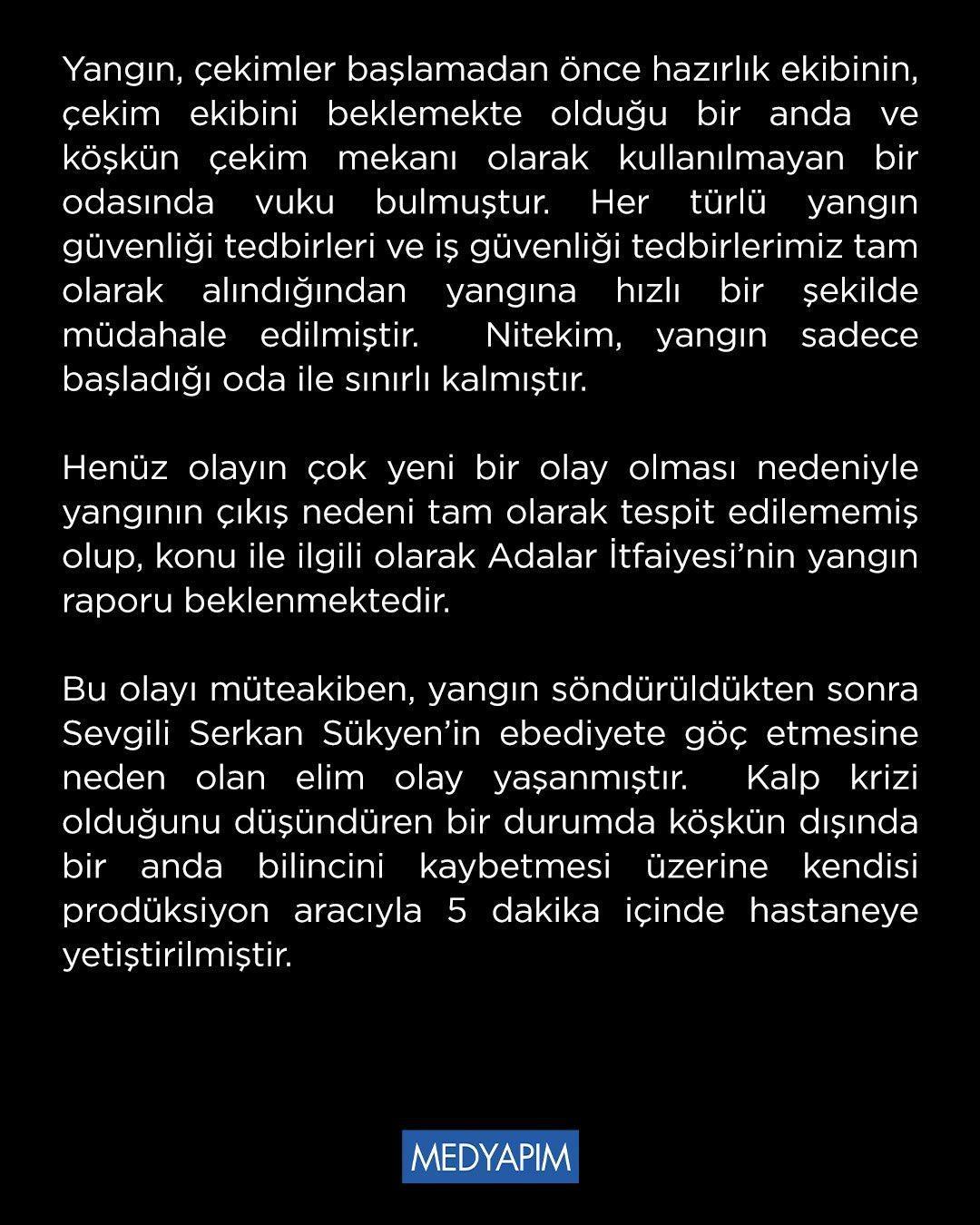 Bu olay müteakiben, yangın söndürüldükten sonra Sevgili Serkan Sükyen’in ebediyete göç etmesine neden olan elim olay yaşanmıştır. Kalp krizi olduğu düşündüren bir durumda köşkün dışında bir anda şuurunu kaybetmesi üzerine kendisi yapım aracıyla 5 dakika içinde hastaneye yetiştirilmiştir.