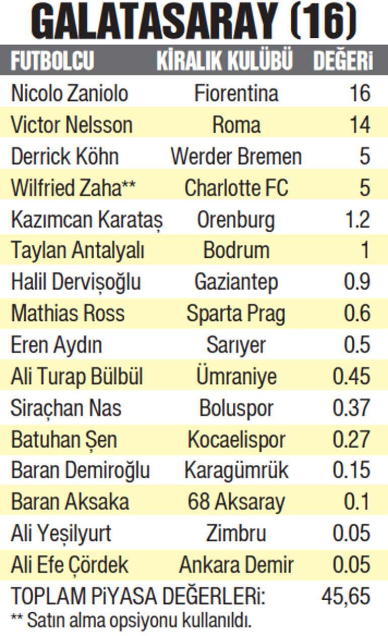 Kiralık gönderilen oyuncular konusunda en çok sorun yaşayacak kulüp Galatasaray gözüküyor… Sarı kırmızılıların kiraya verdiği 16 futbolcudan yalnızca Wilfried Zaha Charlotte FC’de kalmayı garantilerken başka 15 oyuncu ekibe geri döndü. Üstelik bunların içinde 16 milyon Euro’luk Nicolo Zaniolo, 14 milyon Euro’luk Victor Nelsson ve 5 milyon Euro’luk Derrick Köhn de bulunuyor. Başka 11 oyuncudan 9’u ‘maç oynama deneyimi kazansın’ diye kiralanan gençler (Mathias Ross, Eren Aydın, Ali Turap Bülbül, Siraçhan Nas, Batuhan Şen, Baran Demiroğlu, Baran Aksaka, Ali Yeşilyurt, Ali Efe Çördek), 2’si ise teknik heyetin gözüne giremeyen Halil Dervişoğlu ve Taylan Antalyalı.