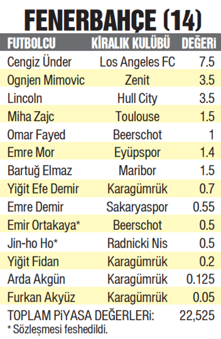 Fenerbahçe , dönem başında 14 futbolcusunu kiraya gönderdi. Bunlardan 6’sı altyapıdan yetişen Emre Demir, Yiğit Efe Demir, Buyruk Ortakaya, Yiğit Fidan, Arda Akgün ve Furkan Akyüz, 5’i ‘geleceğe yatırım’ olarak alınan Onjgen Mimovic, Bartuğ Elmaz, Omar Fayed, Jin-ho Ho, Emre Demir, öteki 3’ü ise A ekipte forma giyme talihi olmayan Cengiz Ünder, Lincoln Henrique ve Emre Mor’du. Buyruk ve Jin-ho ile yollarını geçtiğimiz aylarda ayıran sarı lacivertlilerin öteki 12 oyuncuyu tekrar kiraya vermesi bekleniyor. Bu dönemi kirada geçiren isimlerin en başarılısı, Karagümrük’te 37 maç oynayan 20 yaşındaki stoper Yiğit Efe Demir olurken, Sakaryaspor formasını terleten Emre Demir de 32 müsabakada 9 gol, 1 asist üretti.