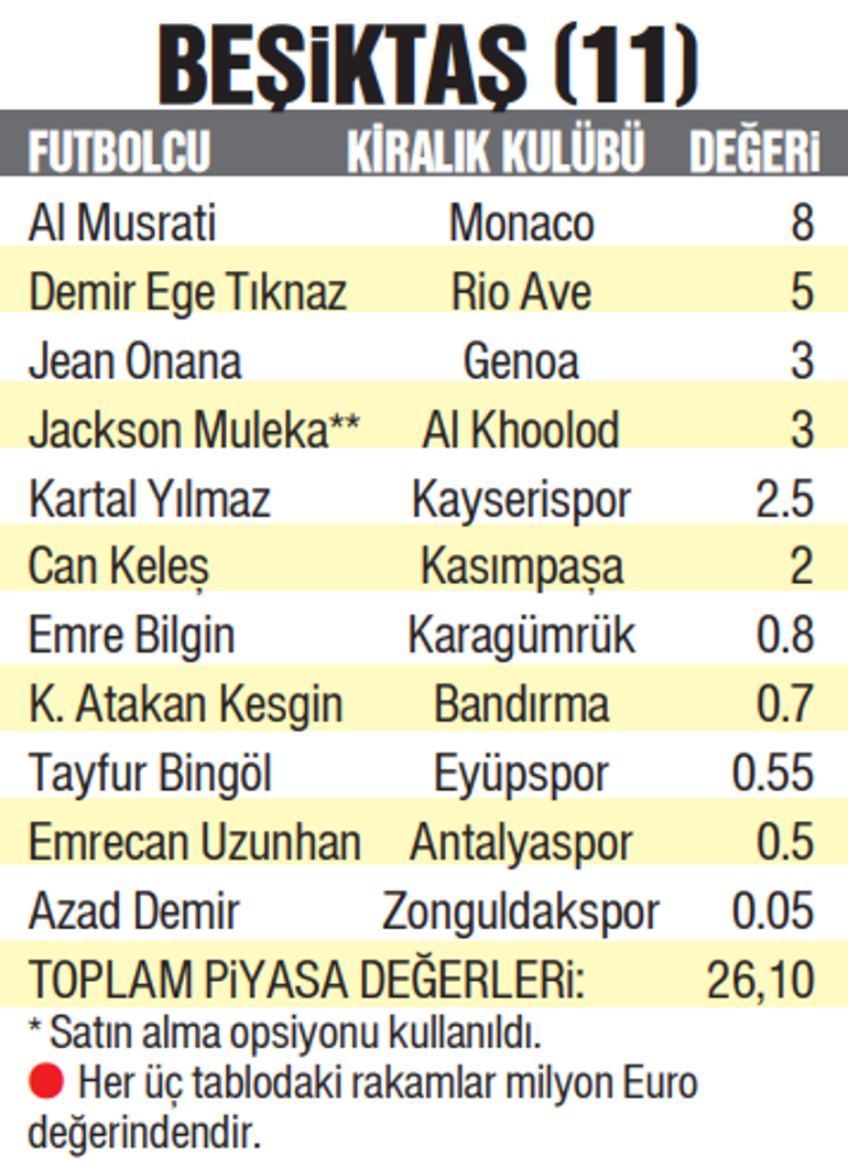 Beşiktaş’ın da kiraya verdiği 11 futbolcudan yalnızca 1’i (Jackson Muleka-Al Khoolod) gittiği grupta kalırken, başka 10’u geri döndü. 12 milyon Euro’luk bonservis bedeliyle kulüp tarihinin en kıymetli transferi olan Al-Musrati, 2023’te 4 milyon Euro’ya alınan Jean Onana, 2022’de 1.4 milyon Euro’ya transfer edilen Kerem Atakan Kesgin, tıpkı yıl bonservisinin yarısına 2 milyon Euro ödenen Emrecan Uzunhan ve geçen sene 2 milyon 750 bin Euro’ya alınan Can Keleş de bu isimler ortasında. Ayrıyeten Tayfur Bingöl, Azad Demir, Kartal Yılmaz, Emre Alım ve Demir Ege Tıknaz da Beşiktaş’a döndü. Bu isimlerden yalnızca Demir Ege’nin A grupta kalması, oburlarının tekrar kiraya verilmesi bekleniyor.