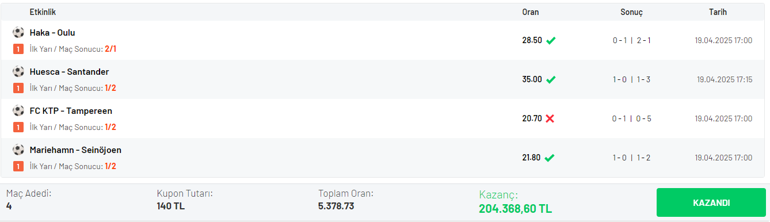 Misli üyesi, İlk Yarı / Maç Sonucu: 1/2 iddiasıyla kuponun en yüksek oranı olan 35.00’i bilmiş oldu.