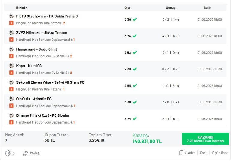 Misli üyesi, Pazar bülteninde yer alan farklı liglerden 7 karşılaşmaya Handikaplı Maç Sonucu ve Maçın Geri Kalanını Kim Kazanır? iddiasında bulundu. Misli üyesinin kuponunda yer alan maçlarda goller adeta gol olup yağdı. Çekya Bölgesel Ligi’nde oynanan ZVVZ Milevsko – Jiskra Trebon müsabakasına Handikaplı Maç Sonucu (Deplasman:5): 1 iddiasında bulunan Misli üyesinin heyecanı son dakikalara kadar sürdü. Maçın birinci yarısında Milevsko, tesirli bir oyun sergileyerek devreyi 4-0 önde kapattı. İkinci yarıda da üstünlüğünü sürdüren mesken sahibi grup, iki gol daha bularak skoru 6-0’a taşıdı. Son gol ise 81. dakikada Matěj Volf’un ayağından geldi. Bu sonuçla birlikte Milevsko, ligdeki son beş maçında dördüncü galibiyetini elde etti. Böylece Misli üyesinin “Handikaplı Maç Sonucu (Deplasman:5): 1” kestirimi de tutmuş oldu.