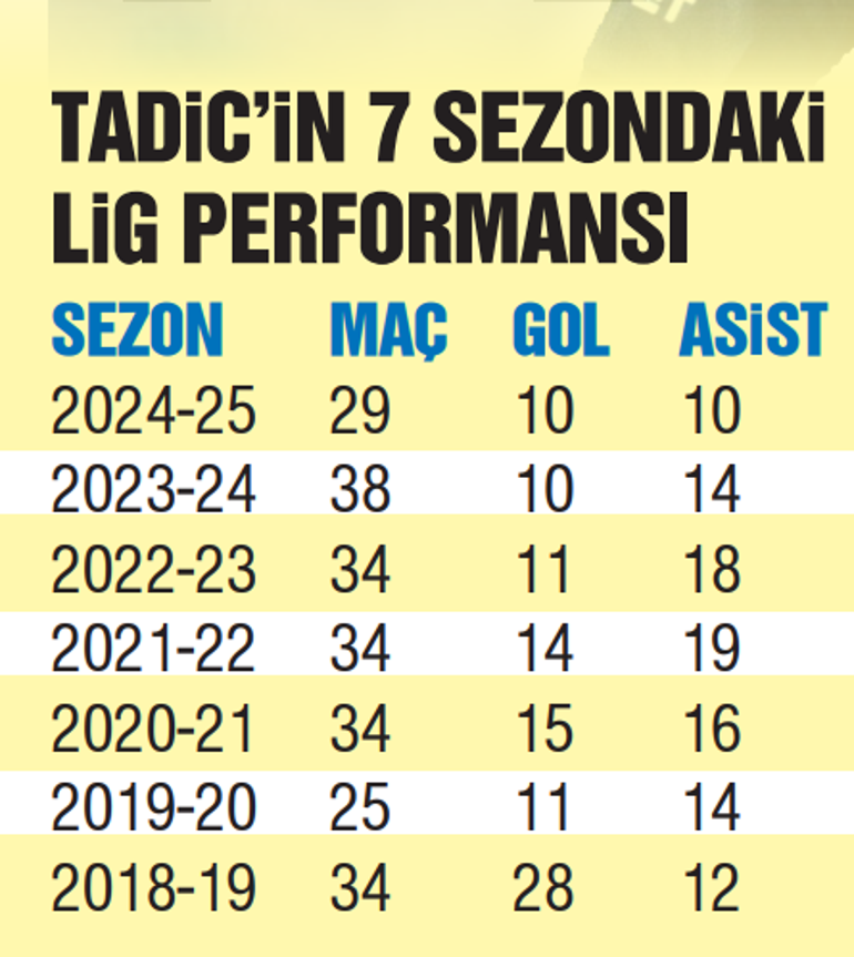 Fenerbahçe’de Dusan Tadic ligde 3 maç ortadan sonra gol sevinci yaşadı ve Harika Lig’deki gol sayısını 11’e çıkardı. 10 da asisti bulunan 36 yaşındaki yıldız bu sezon ligde 21 gole direkt katkı vermeyi başardı. Dusan Tadic bu performansıyla Avrupa’nın 10 büyük liginde son 7 dönemde 10 gol ve 10 asist barajını geçen tek oyuncu oldu.