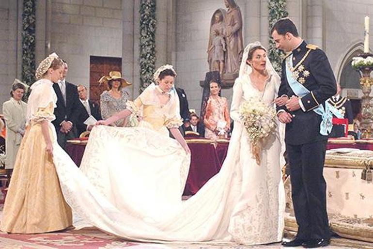 O sırada Asturias Prensi unvanı taşıyan Veliaht Prens Felipe’nin kolunda Madrid’deki Almudena Ketadrali’nde etrafına gülümseyen Letizia’nın gelinliği o güne kadar görülmüş tipten değildi.