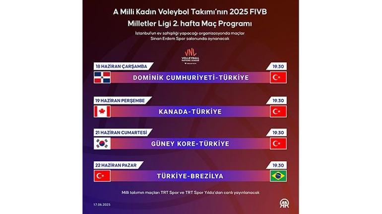 A Ulusal Bayan Voleybol Grubumuz, 2025 Voleybol Milletler Ligi (VNL)’nin ikinci haftasında bugün İstanbul’da Dominik Cumhuriyeti ile karşı karşıya geliyor.