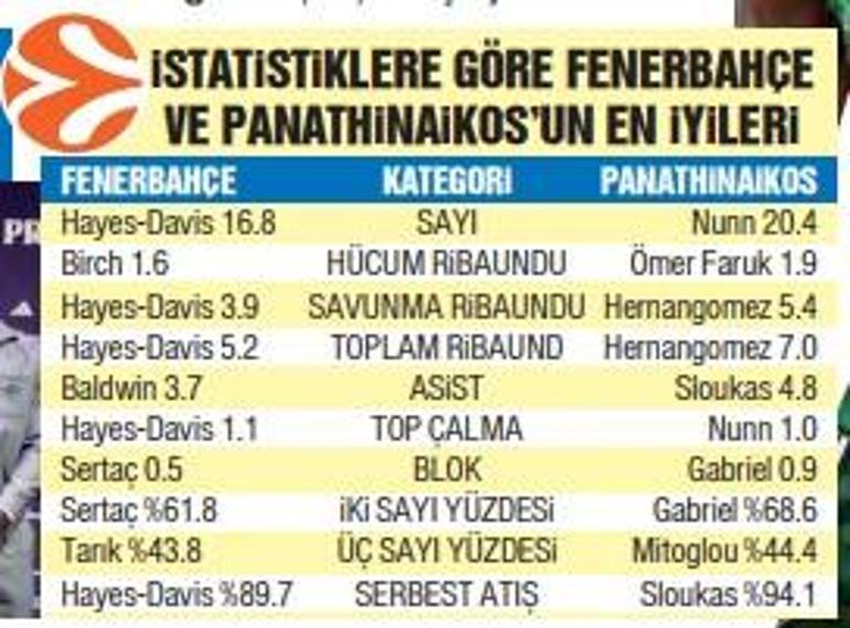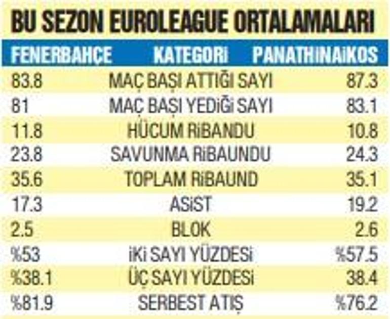 Fenerbahçe Beko ile Panathinaikos’un bu dönem THY Euroleague’deki istatistikleri, temsilcimizin savunmada, Yunan takımının ise hamlede daha başarılı olduğunu ortaya koyuyor. Sarı lacivertliler maç başı ortalama 83.8 sayı üretirken, Panathinaikos 87.3 sayı attı. Fenerbahçe ortalama 81 sayı, Panathinaikos 83.1 sayı yedi. İki grubun ferdi bazda en tesirli oyuncuları Nigel Hayes-Davis ve Kendrick Nunn oldu. Hayes-Davis, maç başı ortalama sayı (16.8), ribaund (5.2), top çalma (1.1) ve hür atış yüzdesinde (89.7) Fenerbahçe’nin en başarılı oyuncusu. Panathinaikos’ta ise sayı üretiminde Nunn (20.4), ribaundda Hernangomez (7.0) öne çıkıyor.
