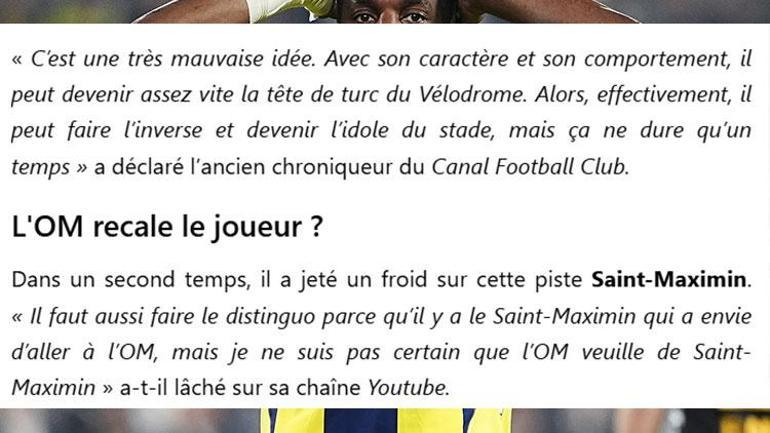 “Bu çok makûs bir fikir. (Maximin’in Marsilya’ya transferi. Karakteri ve davranışlarıyla Velodrome’un günah keçisi haline gelebilir. Natürel, tam aykırısını yapıp taraftarın idolü de olabilir lakin bir kısa bir mühlet devam eder.