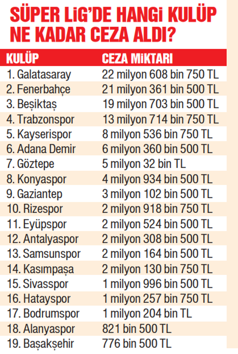 Lig şampiyonu Galatasaray cezalarda da 22.6 milyon TL ile birinci sırada yer aldı.