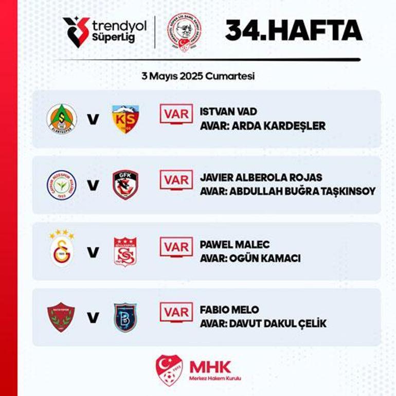 Süper Lig’in 34. haftasında, Cumartesi günü oynanacak maçların VAR hakemleri belirli oldu.
