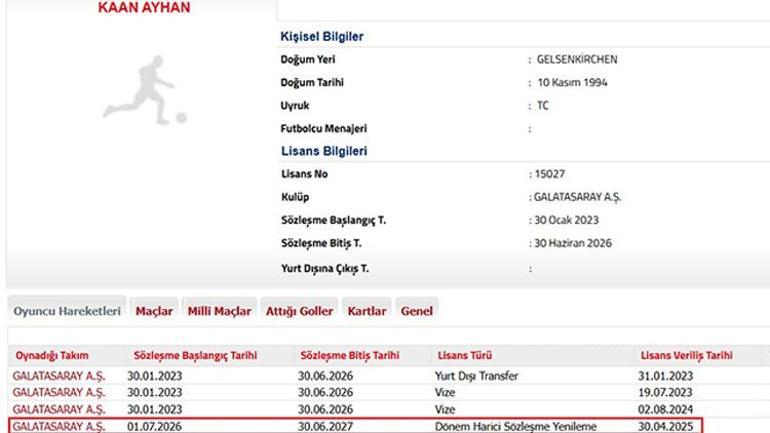Galatasaray’dan TFF’ye yapılan bildirimde Kaan Ayhan’ın Haziran 2026’da bitecek olan mukavelesinin Haziran 2027’ye dek uzatıldığı belirtildi.