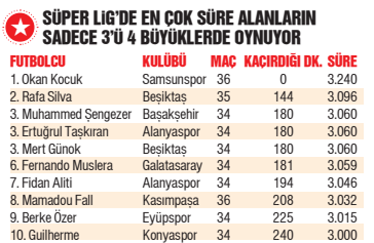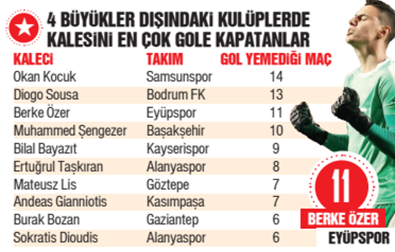 Sezonun en başarılı kalecileri sıralamasında Samsunsporlu Okan Kocuk’un başka bir yeri bulunuyor. Kalesini 14 maçta gole kapatan Okan, bu alanda Muhteşem Lig’in en iyisi. Takımının ligi üçüncü bitirmesinde büyük hissesi olan 29 yaşındaki kaleci, aynı zamanda ligde 36 maçın tamamında oynayıp, 1 dakika bile kaçırmayan tek futbolcu. Kalesini en çok gole kapatanlar klasmanında, Bodrum’dan Diogo Sousa (13), Eyüplü Berke Özer (11), Başakşehirli Muhammed Şengezer (10), Kayserili Bilal Bayazıt (9), Alanyasporlu Ertuğrul Taşkıran (8), Göztepeli Mateusz Lis ve Kasımpaşalı Andreas Gianniotis (7) üst sıralarda yer alıyor.