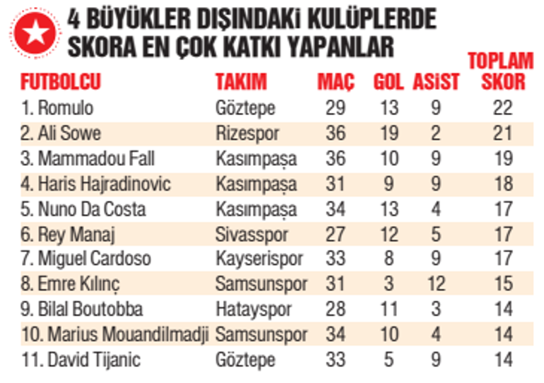 Süper Lig’de en çok gol atan (26) futbolcu olan Galatasaraylı Osimhen’i, 21 golle Başakşehirli Krzsysztof Piatek izliyor. Fenerbahçeli Youssef En-Nesyri’nin 20 golle üçüncü sırayı aldığı listenin dördüncü basamağında 19 golle Rizesporlu Ali Sowe bulunuyor. Piatek ve Sowe’un dışında 4 büyükler dışındaki kulüplerde forma giyen 7 futbolcunun daha 10 ve üzeri sayıda gol attığını görüyoruz: 15 Thiam-Eyüp, 13 Romulo-Göztepe, Da Costa-Kasımpaşa, 12 Manaj-Sivas, Boutobba-Hatay, 11 Fall-Kasımpaşa, 10 Mouandilmadji-Samsun.