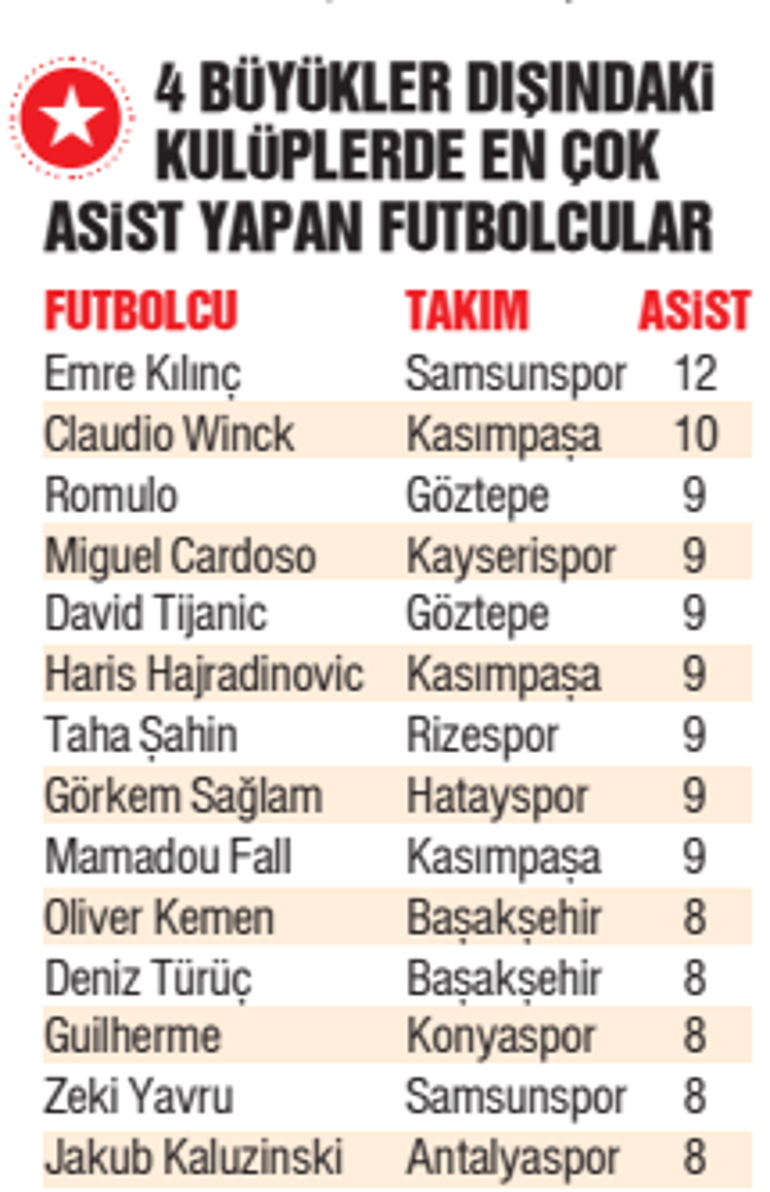 Asist krallığında F.Bahçeli Dusan Tadic (14) doruğa çıkarken, ikinciliği Samsunsporlu Emre Kılınç (12), üçüncülüğü ise Kasımpaşa’nın sağ beki Claudio Winck (10) aldı. 9’ar gol pası veren Romulo, Tijanic (Göztepe), Cardoso (Kayseri), Hajradinovic, Fall (Kasımpaşa), Taha (Rize) ve Hatay’dan Görkem ise üçüncü basamağı paylaştılar. 8 asist yapanlar listesinde ise Beşiktaş’tan Rashica, Masuaku, Fenerbahçe’den Filip Kostic, Kayserispor’dan Kemen, Başakşehir’den Deniz, Konyaspor’dan Guilherme (sol bek), Samsunspor’dan Zeki (sağ bek) ve Antalyaspor’dan Kaluzinski (ön libero) bulunuyor.