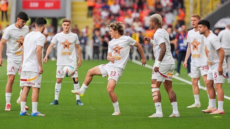 Galatasaraylı oyuncular ısınmaya üzerinde yıldız ve içerisinde futbolcuların fotoğrafının olduğu “şampiyon 2024-2025” yazan tişörtle çıktı.