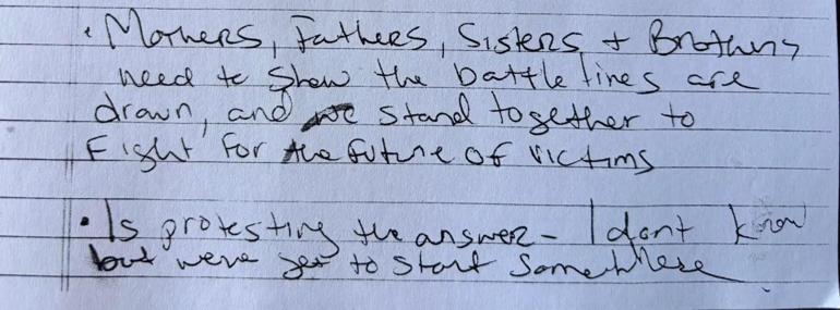 Virginia Giuffre notta “Anneler, Babalar, Kız Kardeşler ve Erkek Kardeşler savaş sınırlarının çizildiğini göstermeli ve kurbanların geleceği için birlikte uğraş etmeliyiz. Protesto etmek tahlil mü? Bilmiyorum. Fakat bir yerden başlamak zorundayız” yazmıştı