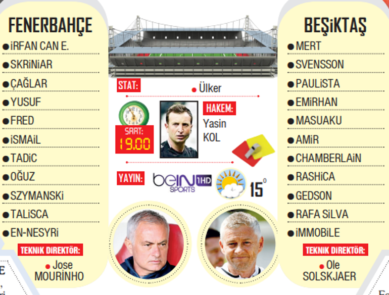 Ligde 17 haftadır yenilmeyen sarı lacivertlilerin teknik yöneticisi Jose Mourinho, Üstün Lig’de birinci derbi galibiyetini elde etmeyi amaçlıyor. Türkiye mesleğinde çıktığı birinci derbide Galatasaray’ı 2-1 yenmenin sevincini yaşayan Ole Gunnar Solskjaer ise Fenerbahçe’ye karşı birinci kere imtihan verecek.