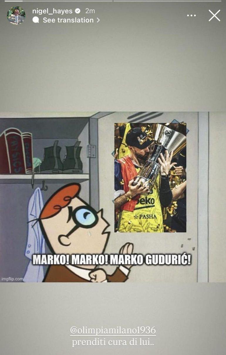 Nigel Hayes, son periyotta ismi Olimpia Milano ile anılan Marko Guduric hakkında toplumsal medyadan bir paylaş yaptı. Hayes-Davis yaptığı paylaşımda Guduric’in EuroLeague kupasını kaldırdığı fotoğrafı Milano’yu etiketleyerek paylaştı ve ‘Ona âlâ bakın’ notunu düştü.