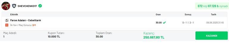 Misli fenomeni Shevchenko17 böylelikle Birinci Yarı Sonucu 2 / Maç Sonucu 1 varsayımını tutturarak 30.00’lık oran yakalamış oldu ve 250.667 TL kazandı. Shevchenko17 bu kuponlarıyla Misli Arena’da günün “En Düzgün 20” kuponu ortasında yer aldı.