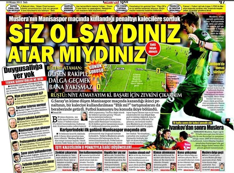 2011-2012 döneminde Üstün Final’e puan avantajıyla gitmek isteyen Galatasaray, 10 kişi kalan rakibi Manisaspor’u rahat bir oyunla 4-0 mağlup etmişti. Maçta en çok konuşulan an ise 83. dakikada yaşanmıştı. Kazanılan penaltı için, tribünlerin de dayanağıyla topun başına geçen kaleci Muslera, golü atmış ve o dönem Galatasaray’da gol atmayan yabancı oyuncu kalmamıştı. Lakin, ligden düşmesi katılaşan Manisaspor’a karşı Muslera’nın penaltı kullanması, tartışmalara neden olmuştu.