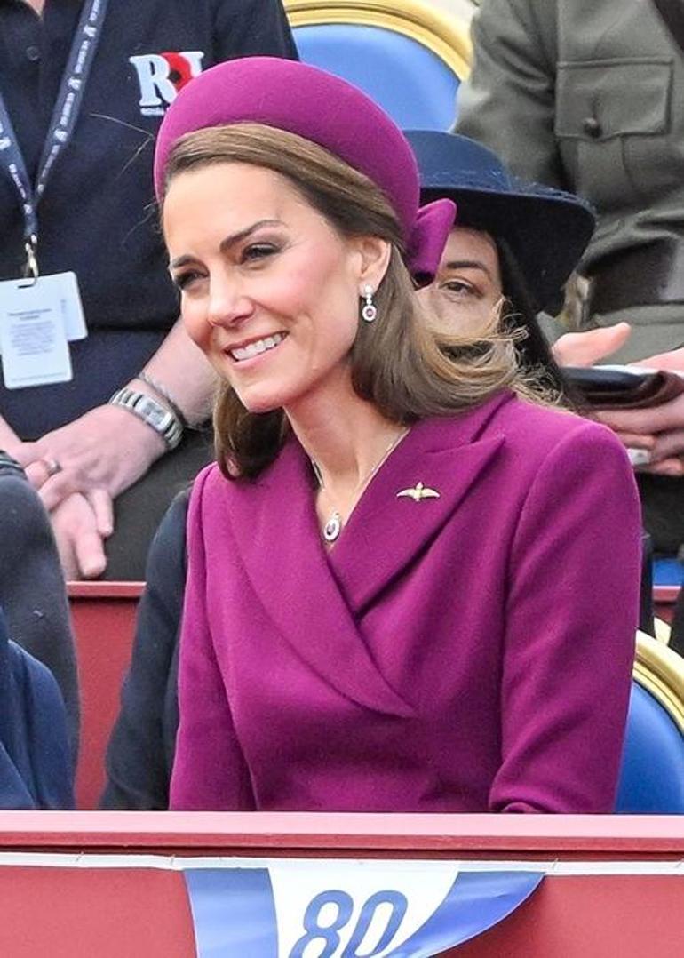Kate’in çok sevdiği modacılardan biri olan Emily Wicstead’in imzasını taşıyan mürdüm rengi bu kıyafet daha evvel de 2022 yılında üzerinde görülmüştü. Hatta onu giydiği gün saç modeli ve şapkası da birebirdi.
