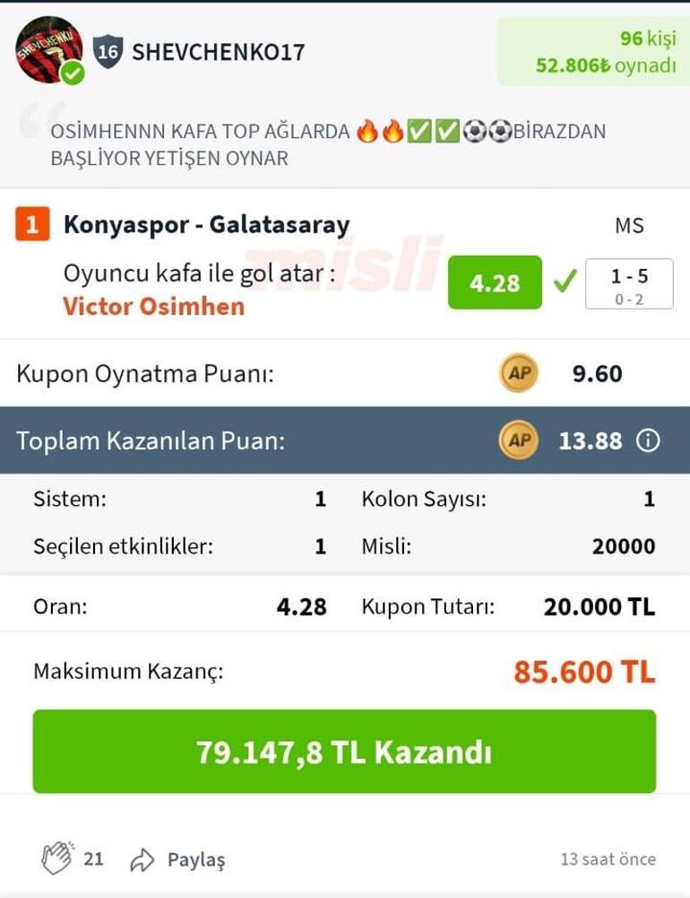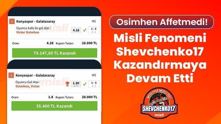 Misli fenomeni Shevchenko17 ise 4.28 orandan Osimhen Başla Gol Atar ve 1.80 orandan ise Osimhen Gol Atar tahminini tutturarak toplamda 114.547 TL kazandı. Shevchenko17 bu kuponlarıyla Misli Arena’da günün “En Düzgün 20” kuponu ortasında yer aldı.