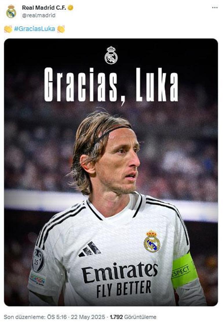 Real Madrid’in resmi X hesabından yapılan paylaşımda, Luka Modric görseli paylaşıldı ve teşekkür edildi.