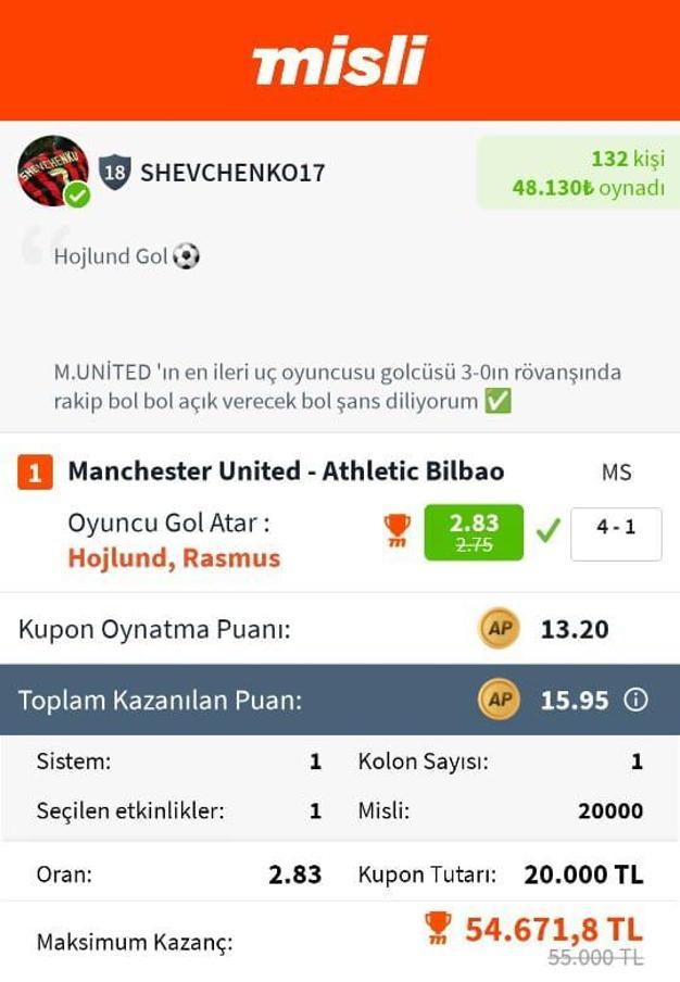 Misli fenomeni Shevchenko17 ise Birinci Yarı Sonucu 2 / Maç Sonucu 1 tahminini tutturarak 23.75’lik oran yakalamış oldu ve 237.500 TL kazanırken 464 bireye de kazandırmış oldu. Shevchenko17 ayrıyeten tekrar tıpkı müsabakada yaptığı oyuncu bahis kuponunda Rasmus Hojlund Gol Atar iddiasıyla 2.83’lük oran sonucu 54. 671 TL kazanmış oldu ve 132 bireye kazandırdı.