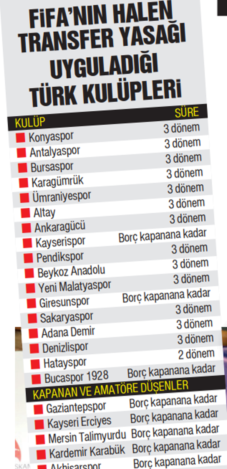 FiFA, nisan ayı içinde Konyaspor, Antalyaspor, Ankaragücü, Karagümrük, Ümraniyespor, Bursaspor ve Altay’a 3’er periyot, Kayserispor’a da borç ödeninceye kadar transfer yasağı cezası verdi. Ortalarında kapatılan ya da amatöre düşenler de dahil toplam 22 Türk kulübünün transfer yasağı cezaları devam ediyor.FiFA, nisan ayı içinde Konyaspor, Antalyaspor, Ankaragücü, Karagümrük, Ümraniyespor, Bursaspor ve Altay’a 3’er devir, Kayserispor’a da borç ödeninceye kadar transfer yasağı cezası verdi. Ortalarında kapatılan ya da amatöre düşenler de dahil toplam 22 Türk kulübünün transfer yasağı cezaları devam ediyor.