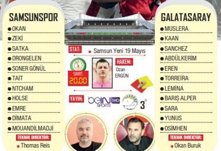 Zorlu deplasmandan galibiyetle dönerek puan farkını korumak isteyen sarı kırmızılılarda Beşiktaş maçında kırmızı kart gören cezalı Frankowksi dışında eksik bulunmuyor. Lakin ceza hududundaki Victor Osimhen, Barış Alper Yılmaz, Davinson Sanchez ve Roland Sallai bugün sarı kart görmeleri durumunda 32. haftadaki Bodrum FK karşılaşmasında oynayamayacak. Samsunpor’da ise Sakatlıkları bulunan Bennasser, Celil ve Bola bugün forma giyemeyecek. Soner Aydoğdu’nun ise kulübede maça başlaması bekleniyor.