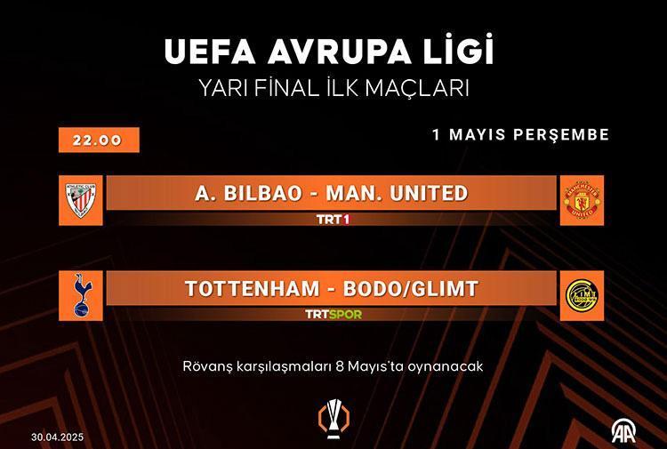UEFA Avrupa Ligi yarı final birinci maçlarında, Athletic Bilbao-Manchester United ve Tottenham-Bodo/Glimt müsabakaları yapılacak.