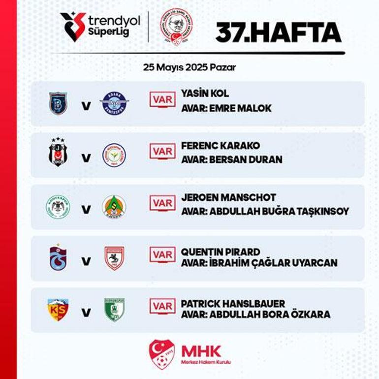 Süper Lig’in 37. Haftasında 25 Mayıs Pazar günü oynanacak maçların VAR hakemleri açıklandı.