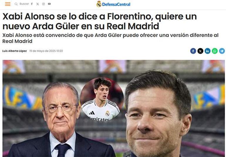 İspanyol basınından Defensa Central’de yer alan haberde Xabi Alonso’nun, Arda Güler ile ilgili kanıları aktarıldı. ‘Xabi Alonso, Florentino’ya Real Madrid’de yeni bir Arda Güler istediğini söyledi’ başlığıyla yer alan haberde şu tabirler kullanıldı: